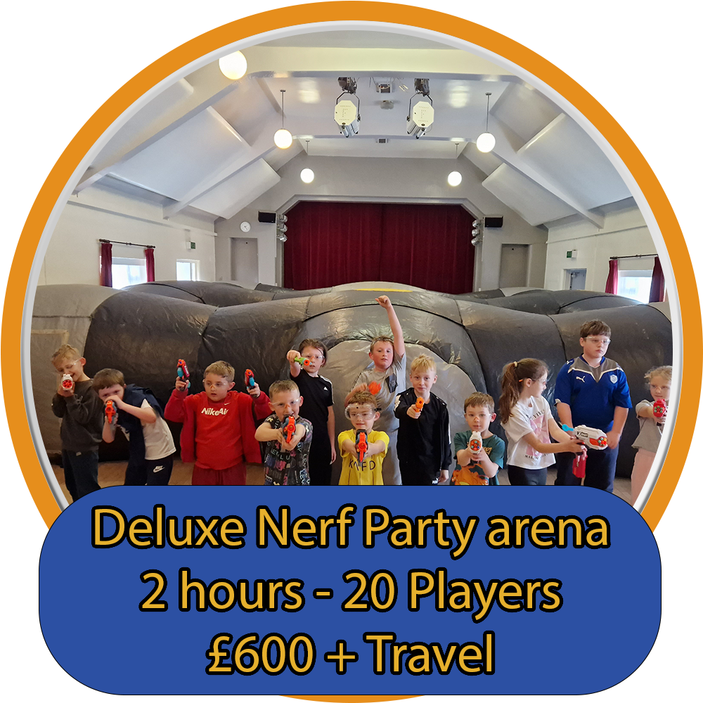 How do our prices work? We have multiple options for parties. Get in touch for a direct quote. We charge for the party itself + a travel cost to your area + any extras. For instance, a 60-minute Nerf party for 30 children with inflatable extras in Sheffield would be: