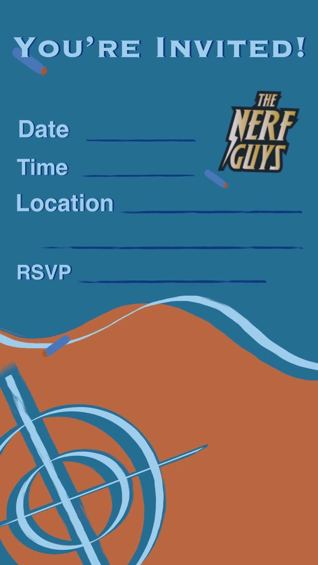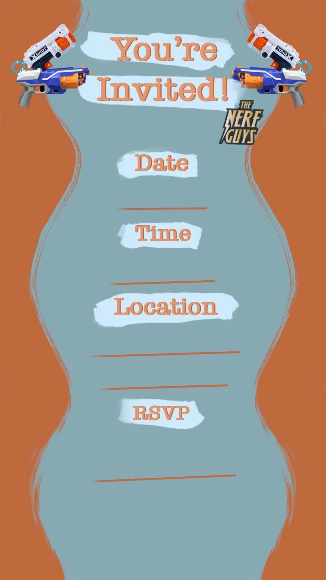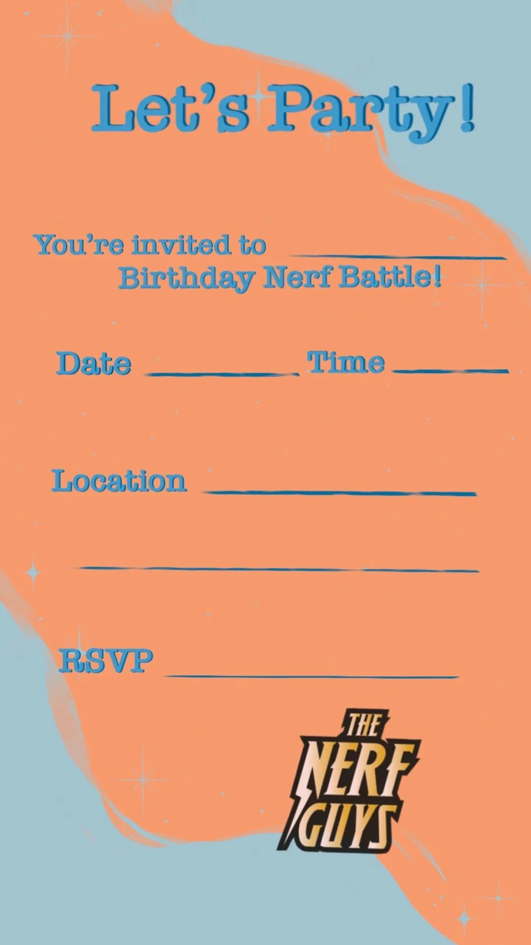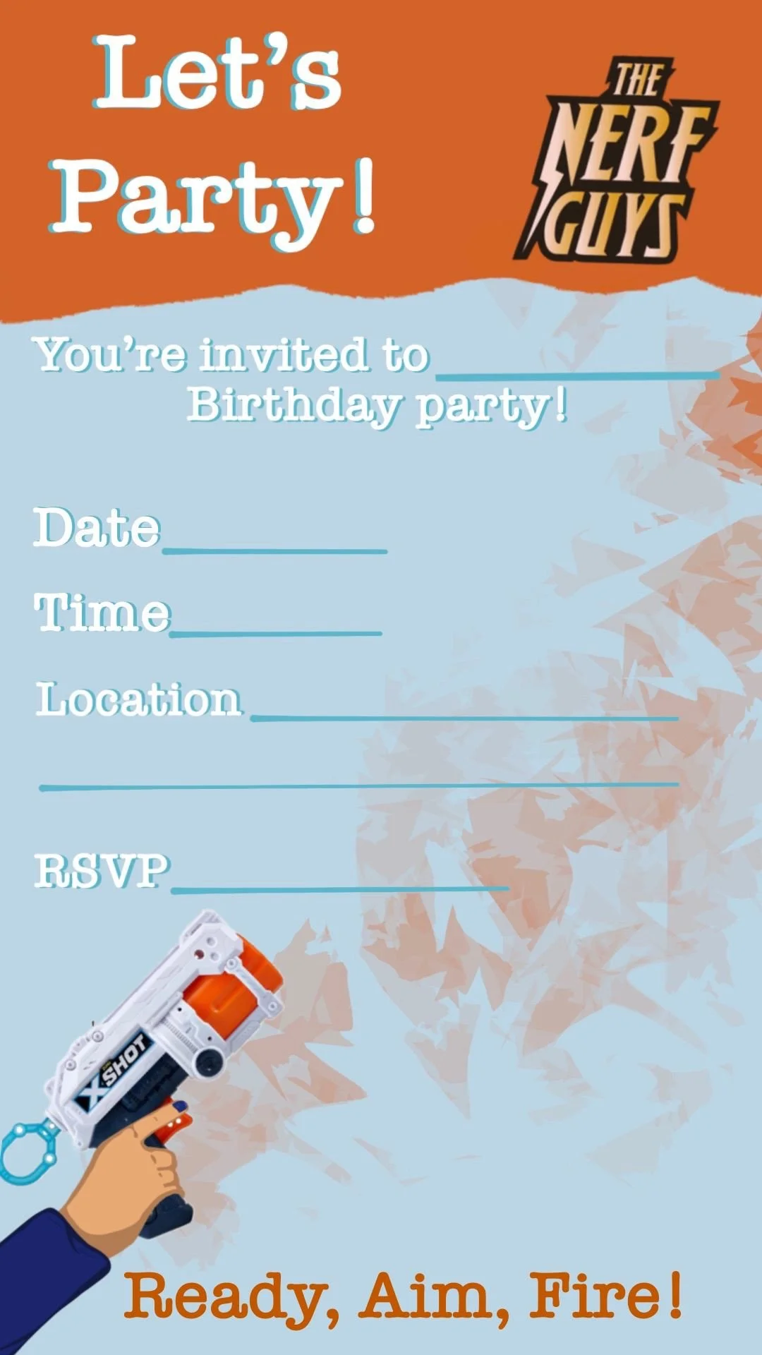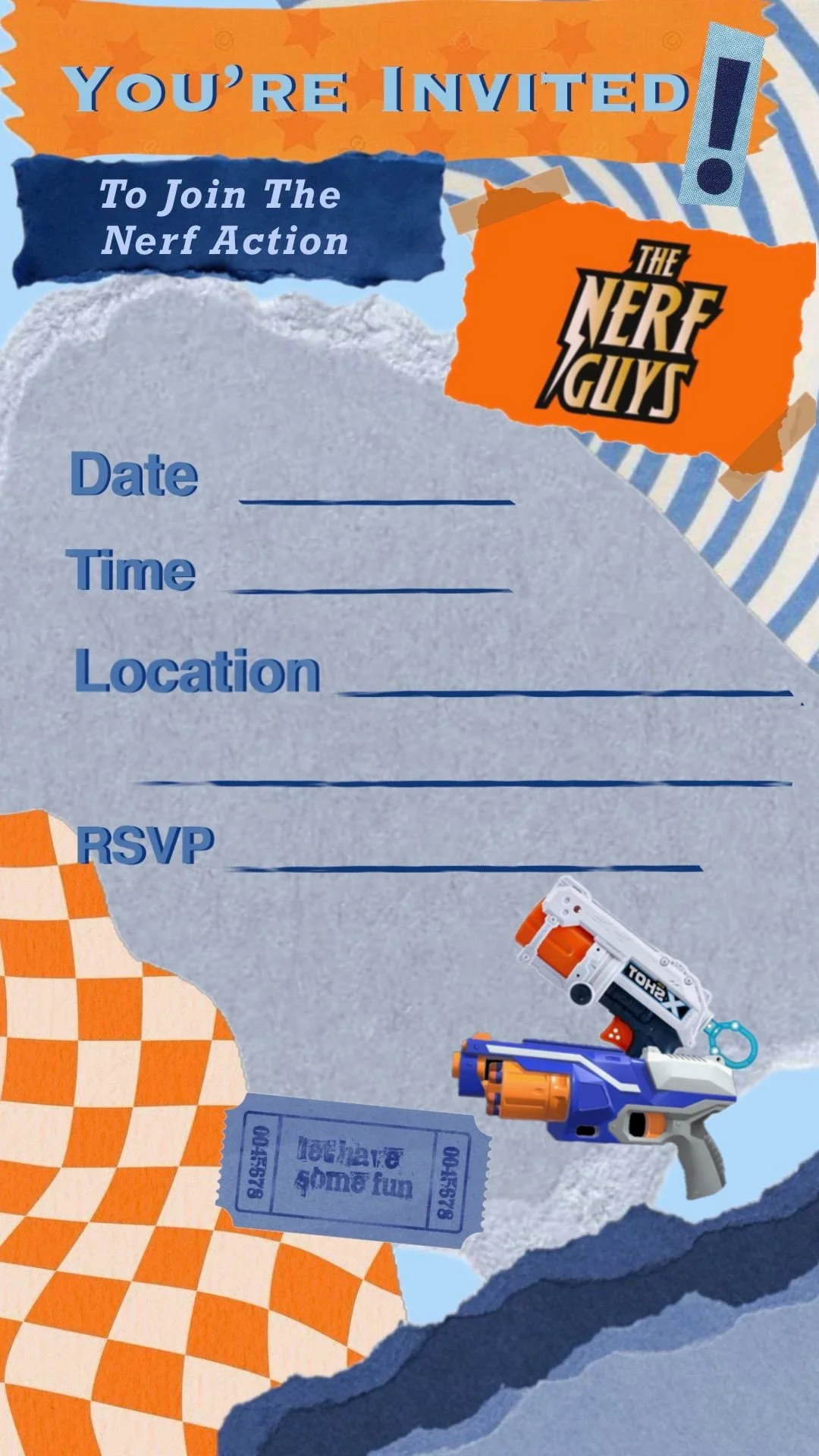 Nerf party invitation with toy blasters and darts, featuring fields for date, time, location, and RSVP details.